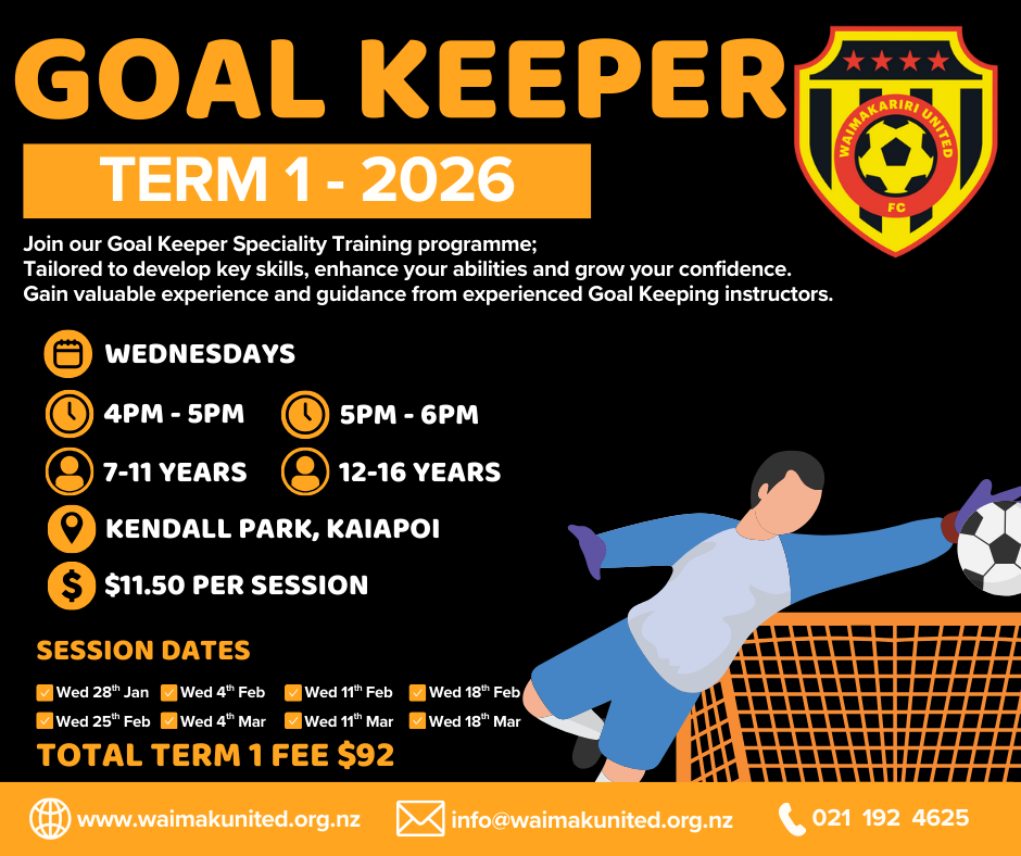 Welcome to the 2026 Term 1 Waimak United Goalkeeper Programme. Tailored to help young goalkeepers develop key skills and confidence in goalkeeping.
