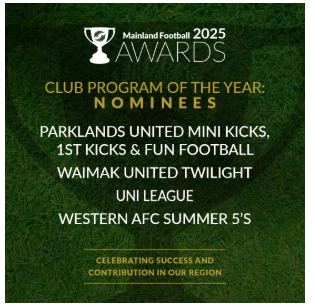 At the recent Mainland Football 2025 Awards Event, Waimak United FC's Twilight Football programme for Primary School Aged kids (Yr 0-8) WON the Mainland Football Community Club Programme of the Year!