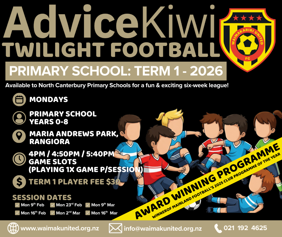 🆕If your school is new to Twilight Football - we would love to have you on board, please contact info@waimakunited.org.nz or call 021 192 4625 if you have any questions.